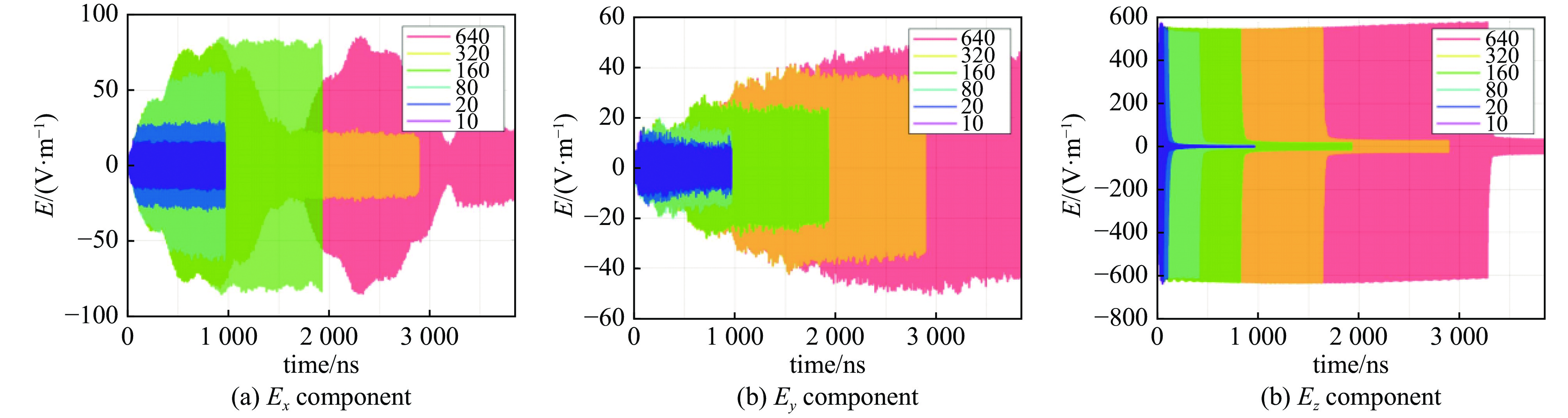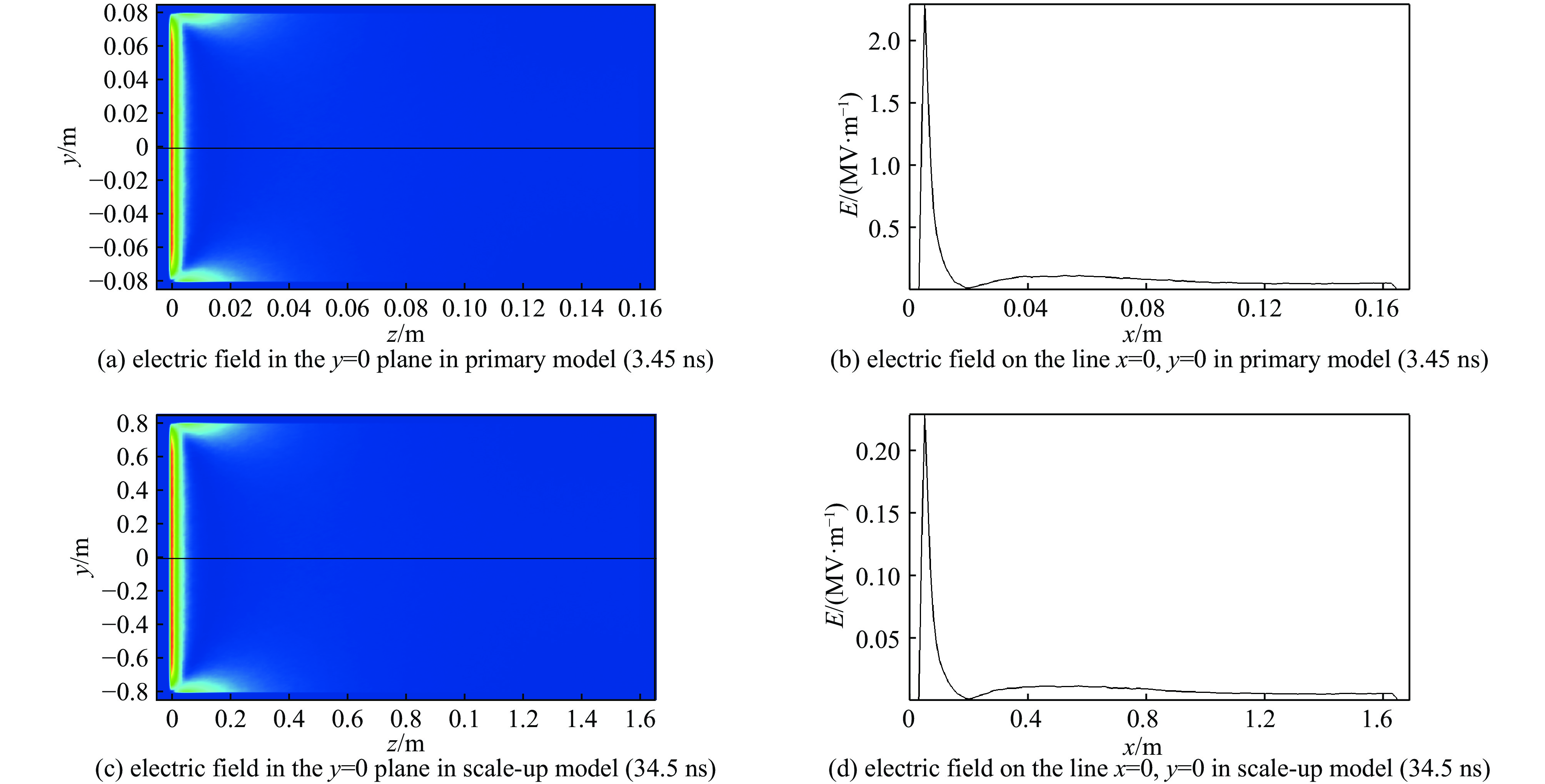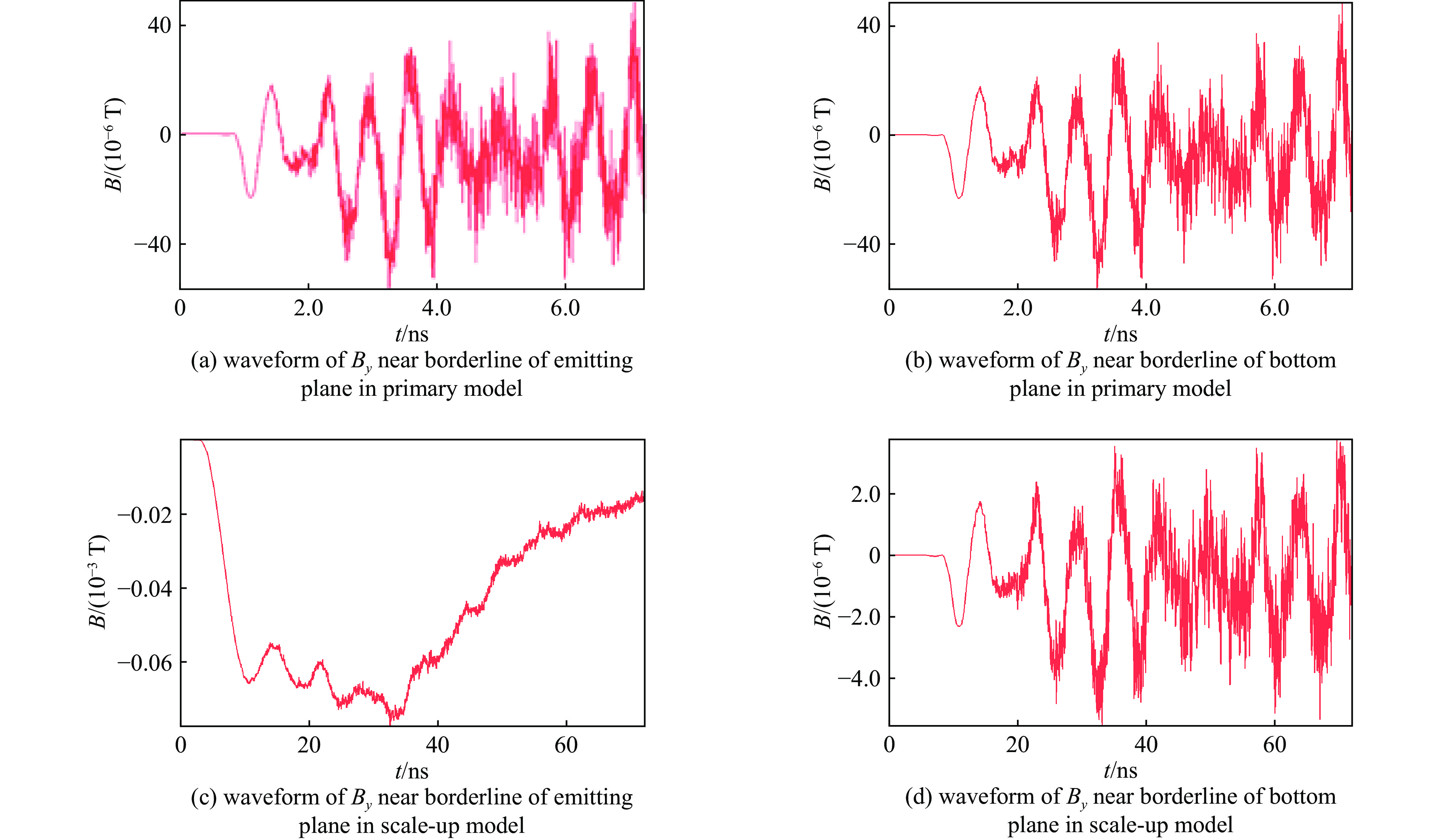 研究系统电磁脉冲(SGEMP)的定标理论,掌握SGEMP的定标法则,并将其应用于腔体SGEMP,提出保持腔壁材料厚度不变的规范变换方法,应用PIC方法进行数值模拟研究,通过对比实验室激光等离子体源条件下的原模型与10倍扩比模型的模拟结果,发现两者在电场、磁场及电荷密度的空间分布规律上呈现严格一致性,幅值大小完全遵循定标关系:发射端面表面电场峰值原模型为2.0 MV/m,扩比模型为200 kV/m;磁场峰值原模型为0.8×10−3 T扩比模型为0.8×10−4 T;电荷密度峰值原模型为6.0×10−3 m−3,扩比模型为6.0×10−5 m−3。模拟结果验证了定标法则应用于腔体SGEMP的有效性。该研究为腔体SGEMP的物理机制解析及实验室模拟实验设计提供了理论依据。
