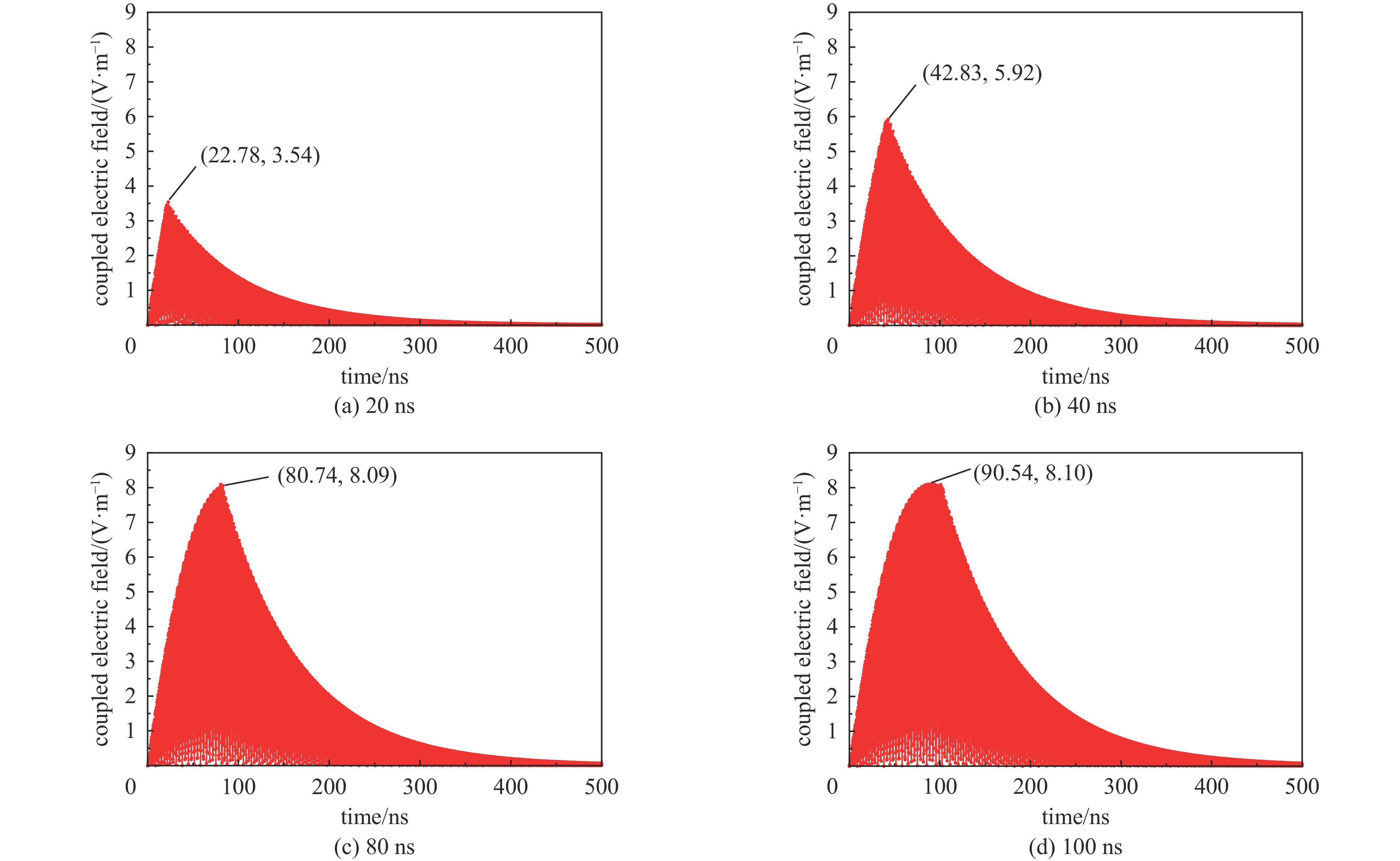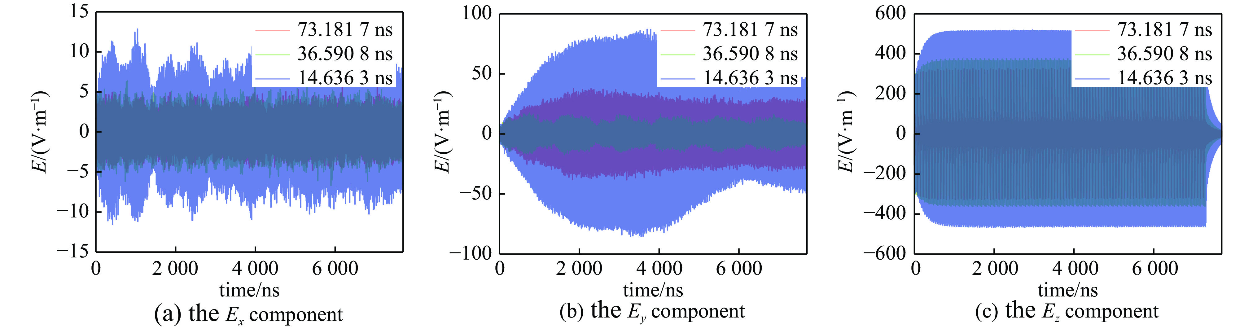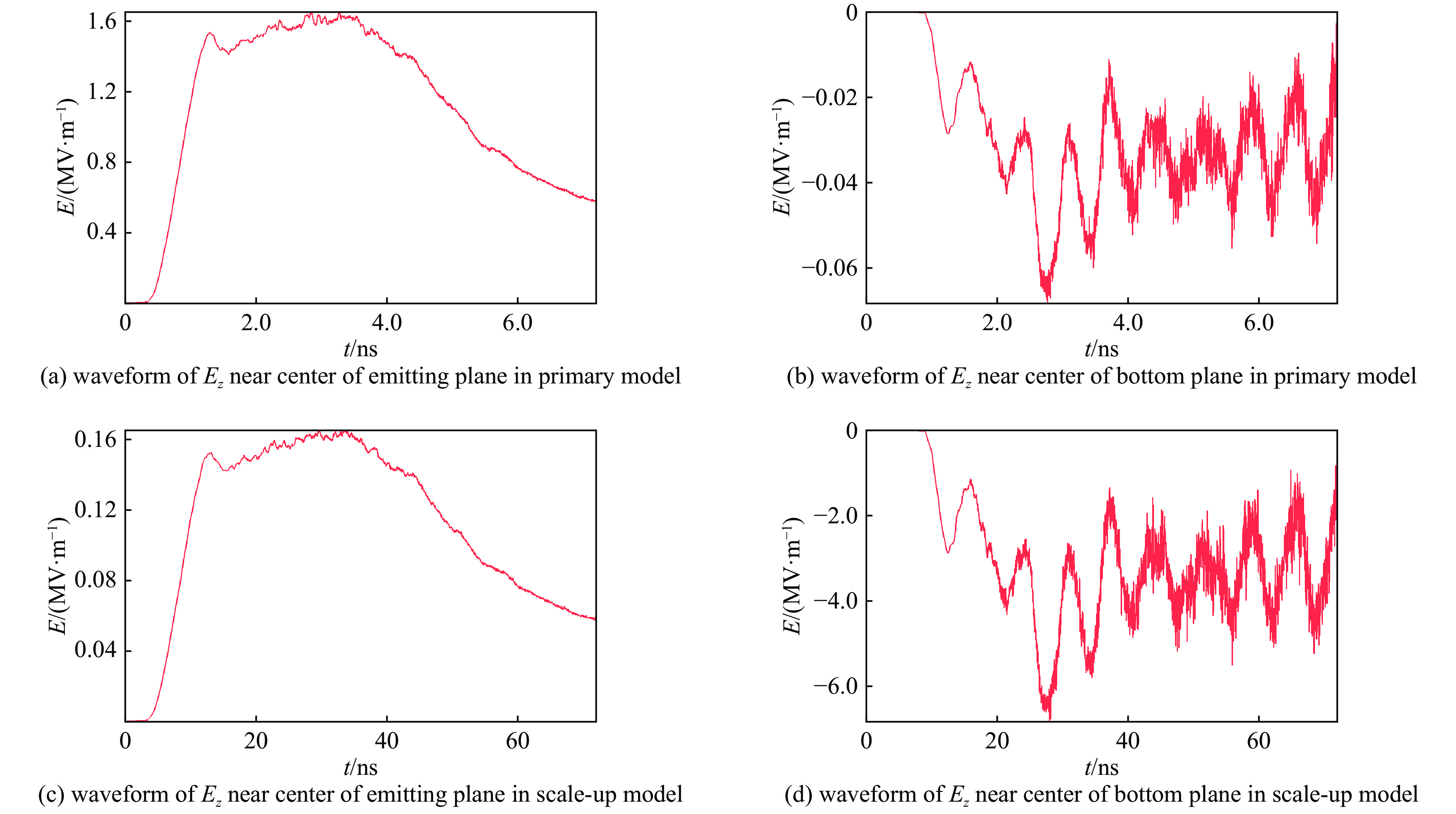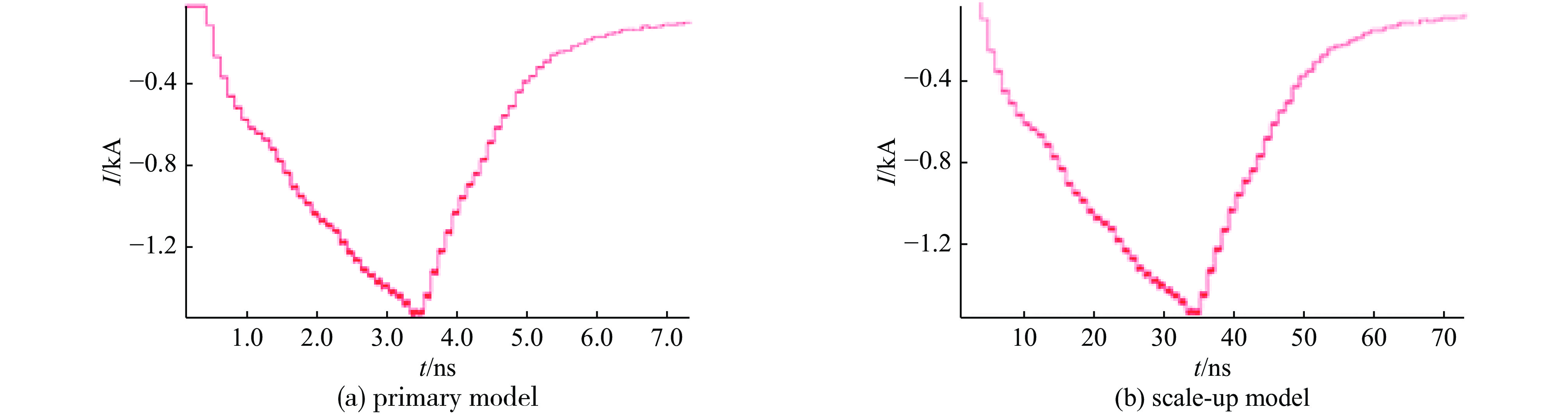 研究系统电磁脉冲(SGEMP)的定标理论,掌握SGEMP的定标法则,并将其应用于腔体SGEMP,提出保持腔壁材料厚度不变的规范变换方法,应用PIC方法进行数值模拟研究,通过对比实验室激光等离子体源条件下的原模型与10倍扩比模型的模拟结果,发现两者在电场、磁场及电荷密度的空间分布规律上呈现严格一致性,幅值大小完全遵循定标关系:发射端面表面电场峰值原模型为2.0 MV/m,扩比模型为200 kV/m;磁场峰值原模型为0.8×10−3 T扩比模型为0.8×10−4 T;电荷密度峰值原模型为6.0×10−3 m−3,扩比模型为6.0×10−5 m−3。模拟结果验证了定标法则应用于腔体SGEMP的有效性。该研究为腔体SGEMP的物理机制解析及实验室模拟实验设计提供了理论依据。