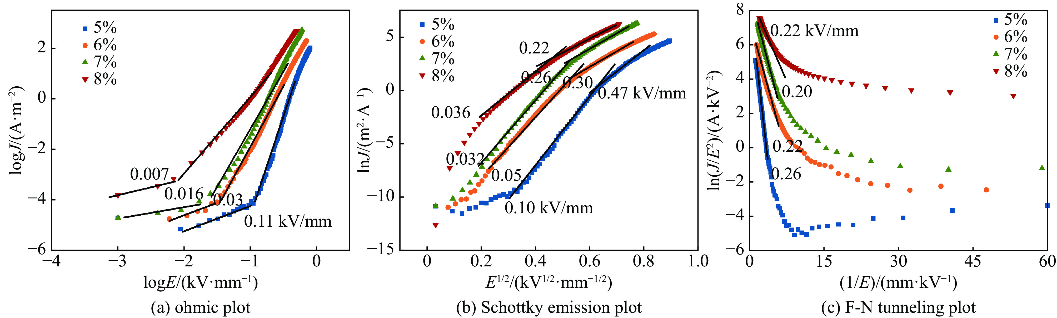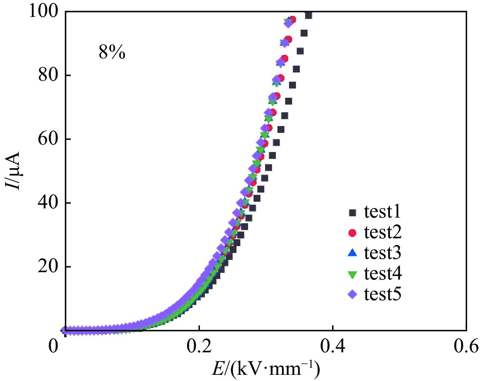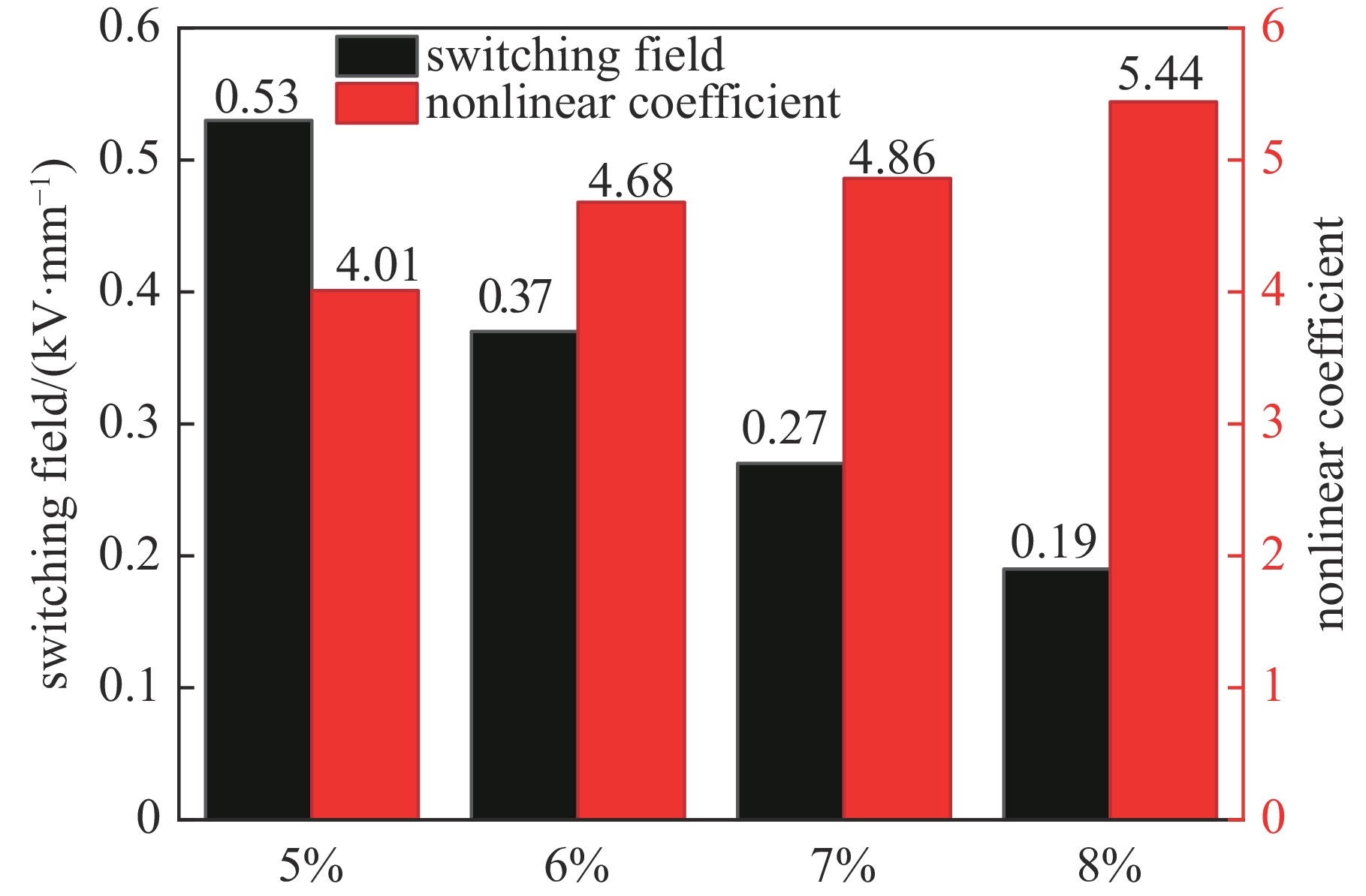 采用溶剂热法合成了氧化锌包覆石墨烯的纳米复合材料。SEM表征显示,氧化锌纳米颗粒均匀覆盖在石墨烯表面,能充分发挥氧化锌的场致相变性能和石墨烯的导电性能及大比表面积优势。制备的GN/ZnO复合材料在质量分数5%~8%时,展现出显著的非线性导电特性,其相变阈值电场为0.19~0.53 kV/mm,非线性系数α为4.01~5.44。实验证实,该材料在低电场下保持绝缘性,高电场下迅速转变为高导电状态,抑制静电放电。不同浓度的复合材料展现出不同的开关场强,可根据操作条件和需求调整材料性能。这为开发智能电磁防护材料提供了理论依据和实践指导。