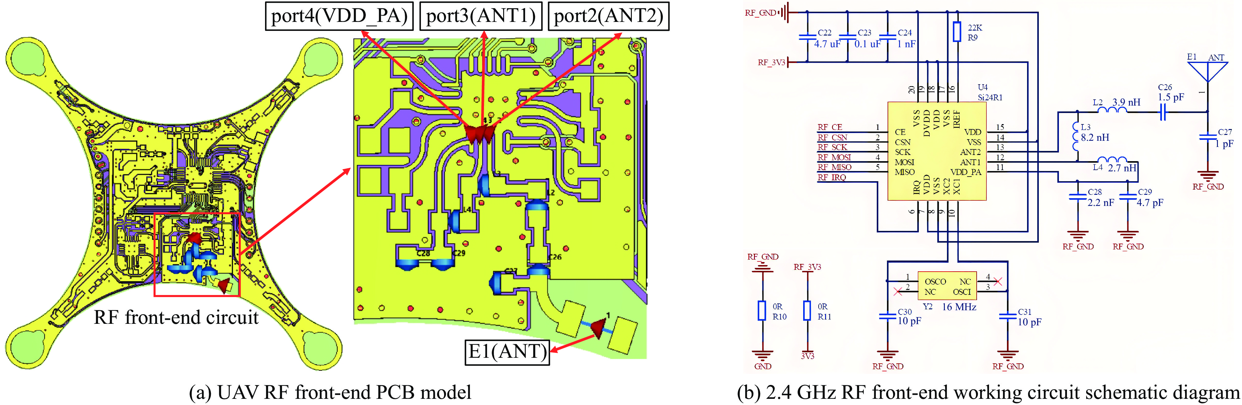 战场无人机的数据链射频前端容易受到高功率微波干扰和损伤而不能正常发挥工作效能。为研究无人机数据链射频前端高功率微波耦合规律与防护,建立数据链天线和射频前端电路PCB仿真模型,以不同载波频率、脉宽、极化方向和上升沿时间的高功率微波分别对数据链天线进行辐照,得到天线输出口端接负载的耦合电压波形,然后将其注入数据链射频芯片外围接收电路中,得到射频芯片引脚的耦合电压,完整模拟了高功率微波的场-路耦合过程。选用一款2.45 GHz的PIN限幅器进行电磁防护。结果表明:无人机数据链射频前端电路的Si24R1芯片引脚耦合电压幅值随着载波频率的上升出现了尖峰现象,随着极化角的增加,耦合电压出现了较大的降低,脉冲宽度和上升沿变化对耦合电压幅值影响不大。PIN限幅器在保证信号接收质量情况下能显著降低高功率微波对射频前端电路的耦合电压,提升了无人机数据链的电磁防护性能。