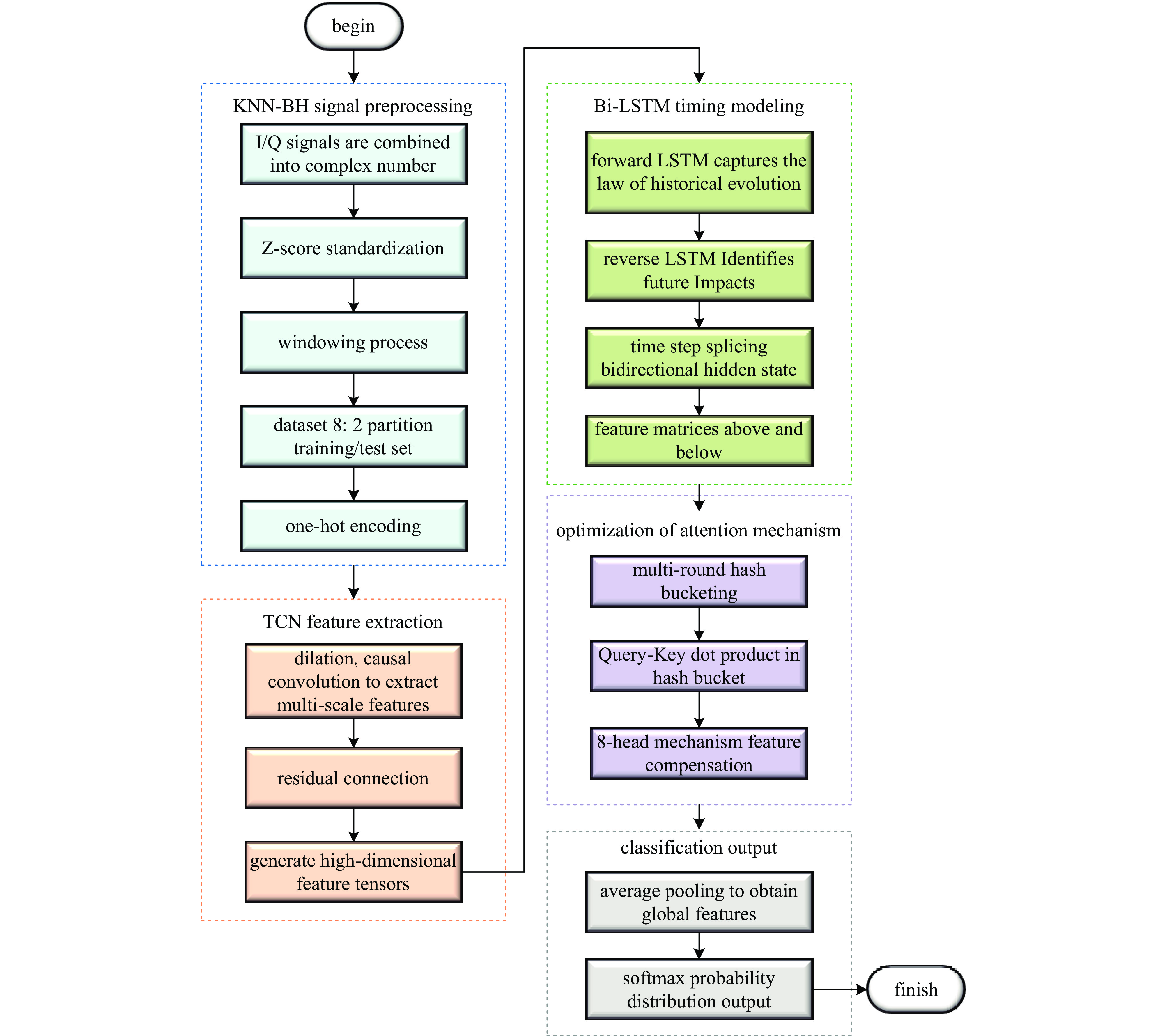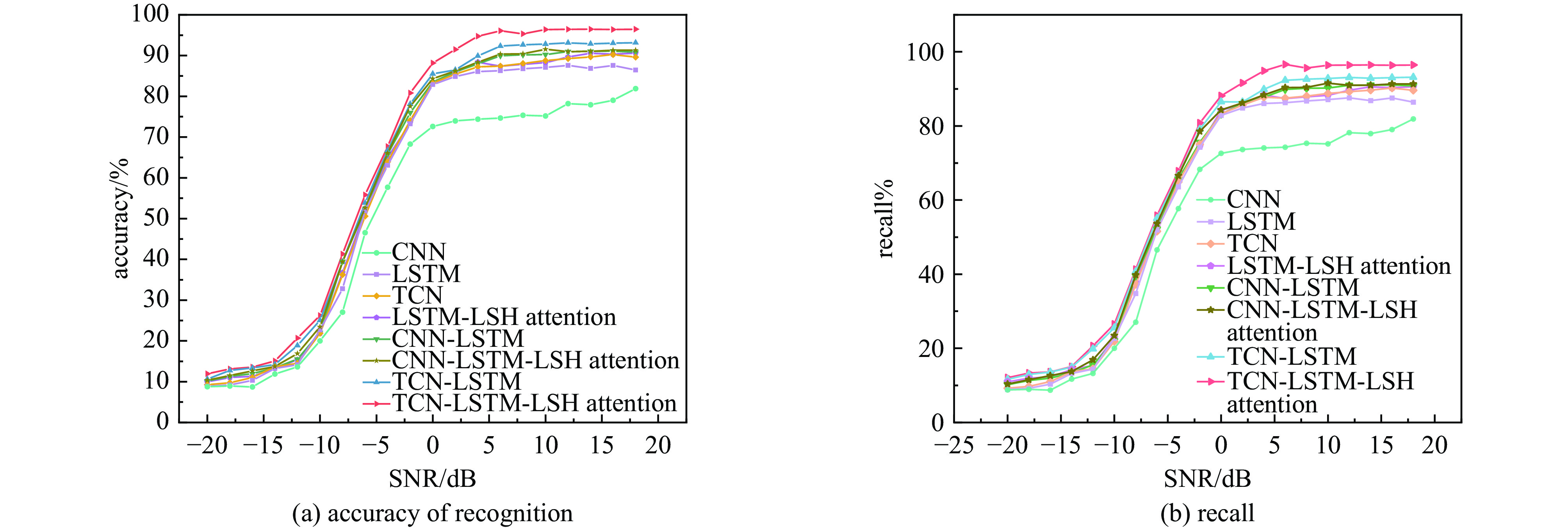 针对电磁频谱环境复杂多域这一问题,提出了基于时序卷积网络与双向长短期记忆网络融合的电磁信号调制识别算法。首先,设计了双向长短期记忆网络(Bi-LSTM)来捕捉时序数据的双向依赖关系,提升对复杂调制模式的判别能力;其次,将时序卷积网络(TCN)与Bi-LSTM通过级联架构进行融合,实现了分层时序特征提取与双向动态建模;最后,加入改进的局部敏感哈希注意力机制(LSH attention),降低注意力矩阵复杂度的同时提高识别的精准度。数据预处理方面提出了一种KNN-BH处理方法,能够提高频谱特征的提取精度。在RML2016.10a数据集上的实验结果表明,相较7个对比算法,TCN-LSTM-LSH attention算法的识别效果最佳,其对11类信号调制的整体识别准确率达到64.71%。证实了该算法在电磁频谱应用中的潜能与价值。