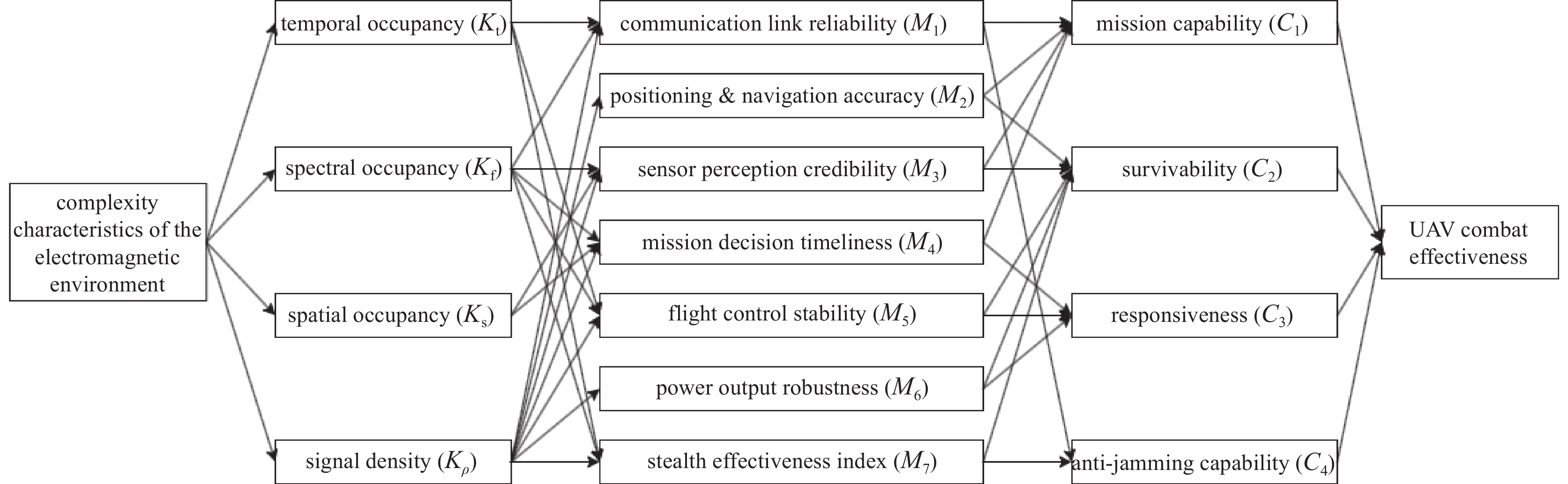 为分析复杂电磁环境对无人机作战效能的影响,建立“复杂度特征-子系统性能-作战能力”三层评估体系。首先区分电磁环境的复杂度特征为时间占用度、频谱占用度、空间占用度及信号密度,并采用层次分析法确定特征权重,其次分解出通信可靠性、导航精度等7项无人机子系统性能指标与任务能力、生存能力、响应能力及抗干扰能力4项作战能力,并建立三者的耦合关系模型,然后通过归一化处理与敏感系数聚合推导出作战效能量化公式,表明电磁复杂度与无人机作战效能呈显著负相关,最后基于MATLAB软件构建复杂电磁战场环境,对不同电磁环境下无人机的作战效能进行仿真,进一步论证结果,并证明相同电磁环境下抗干扰能力强的无人机作战效能更优秀。