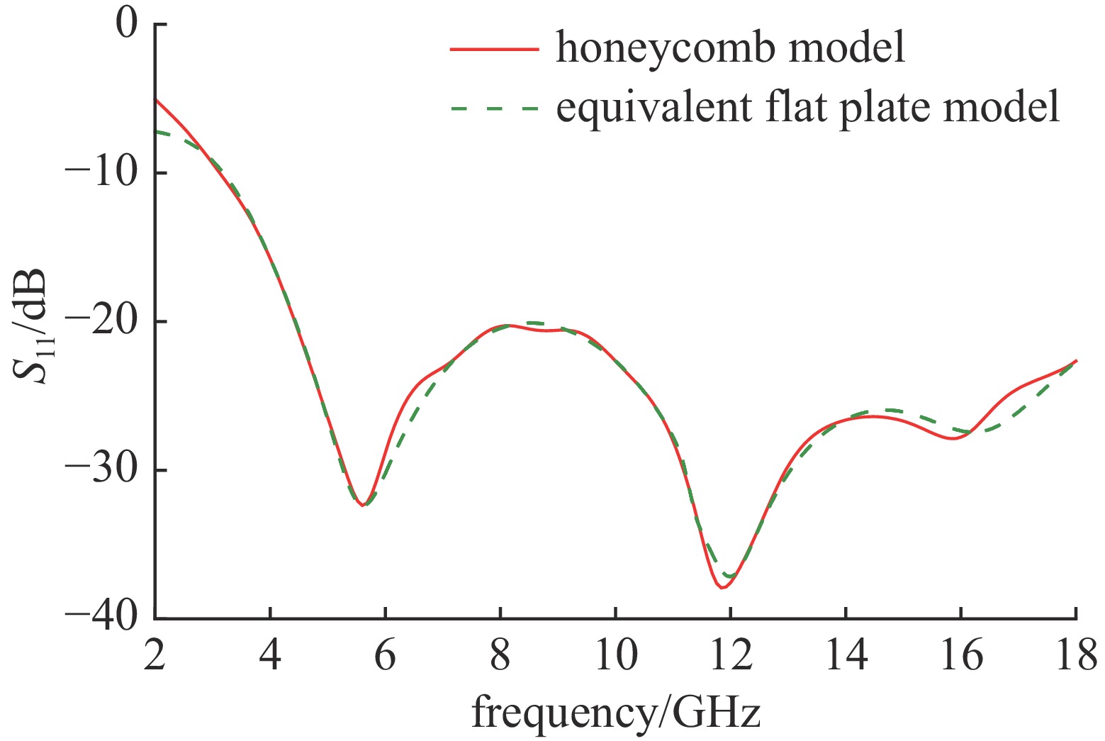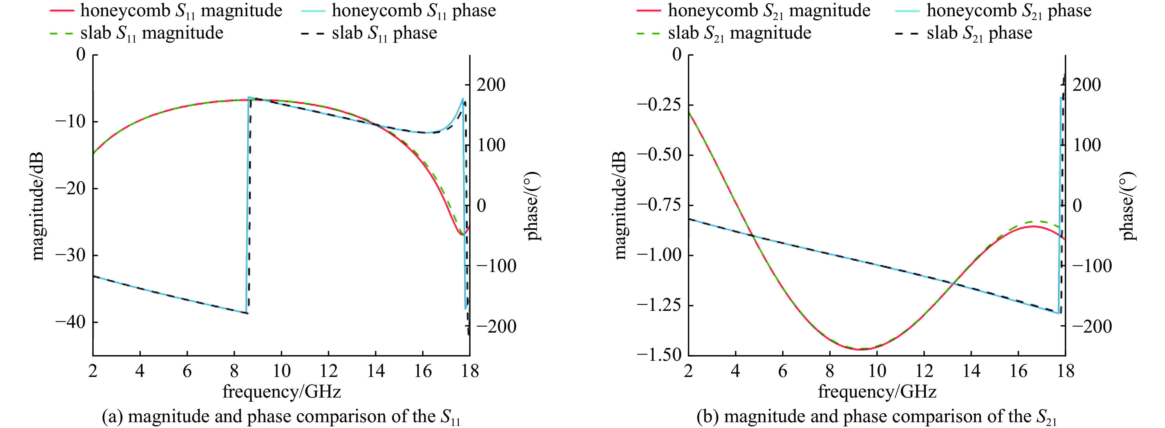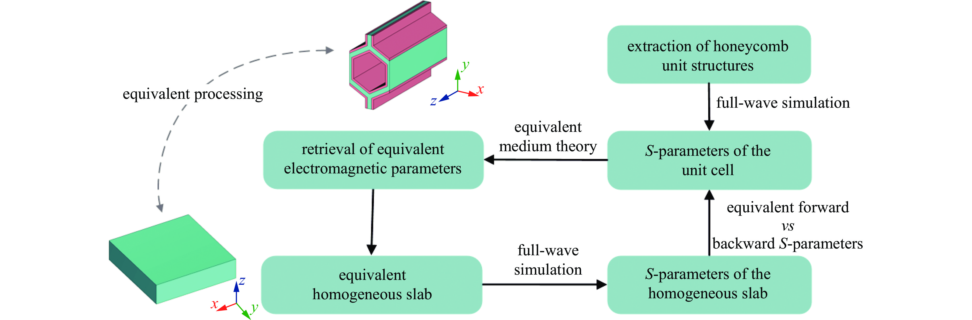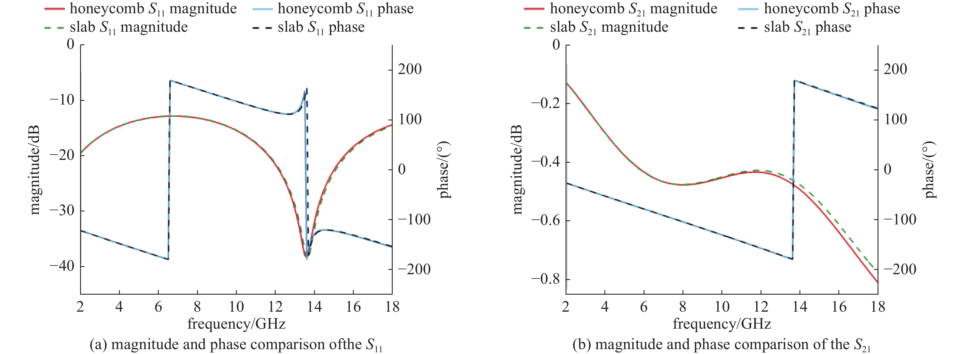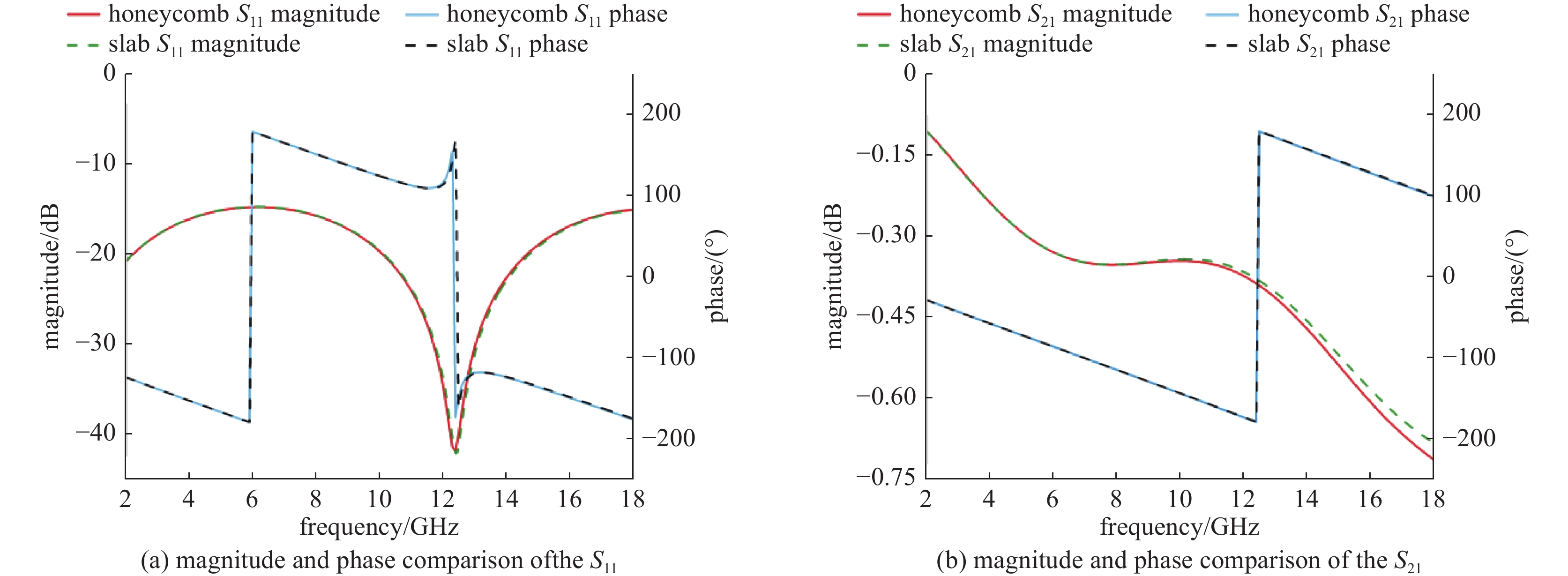 基于改进的S参数反演法,对具有色散特性和各向异性的蜂窝结构复合材料进行了等效化研究。利用三维电磁仿真软件CST与自由空间测试系统,完成对蜂窝结构及其等效平板的建模、仿真和实物测试。通过改变平面波的入射角度,分别获取垂直入射和斜入射条件下的蜂窝模型散射参数。利用反演程序依次推导出各入射条件对应的等效电磁参数,并将其应用于等效的匀质平板中,从而实现对蜂窝结构的等效化处理。通过对比蜂窝结构等效前后散射参数的仿真和实测结果,验证了该方法的准确性和可行性。