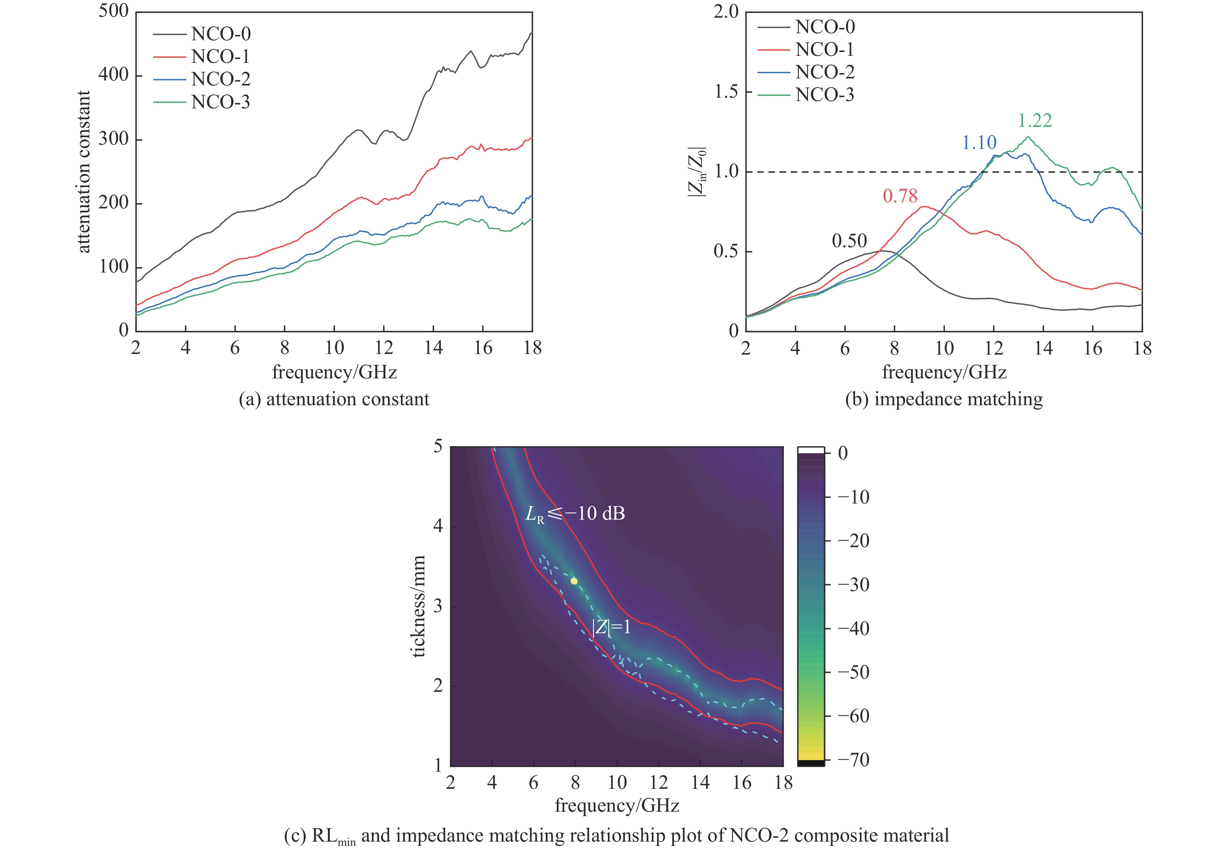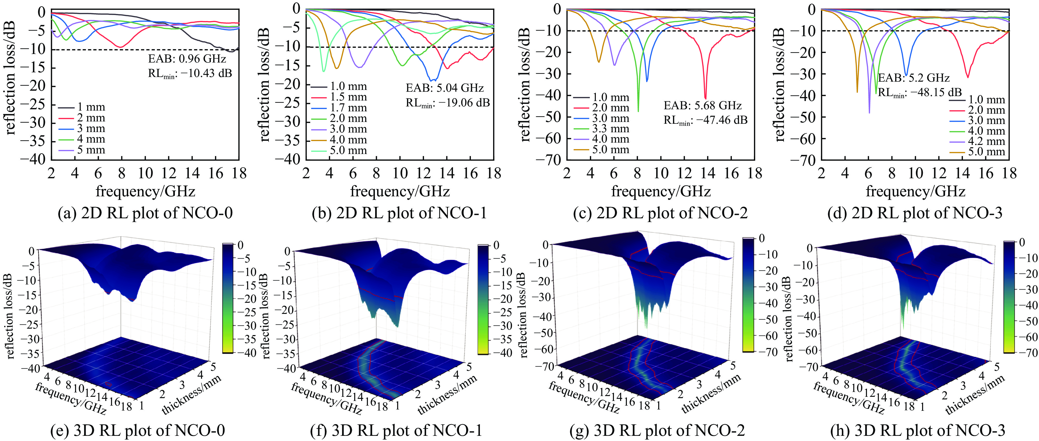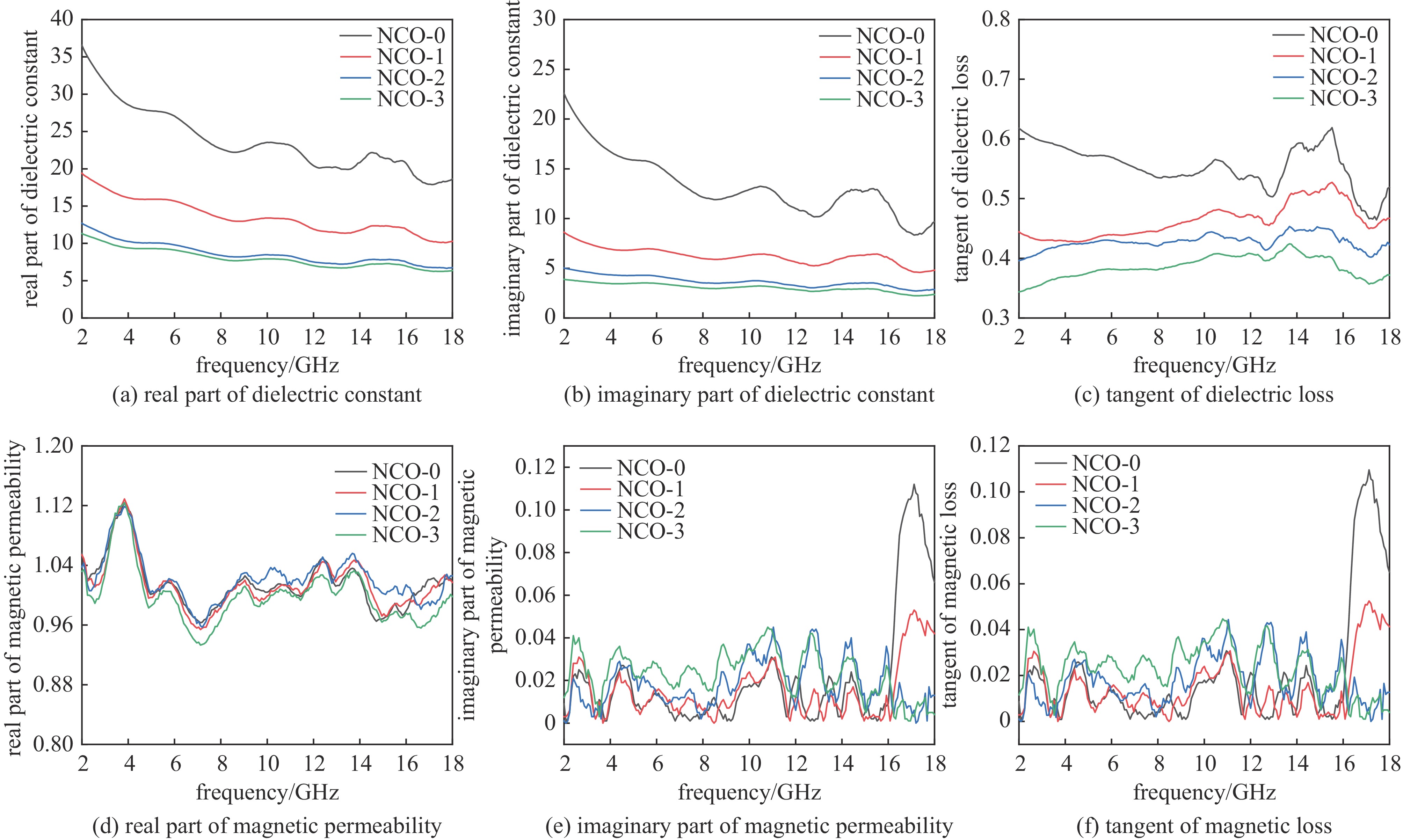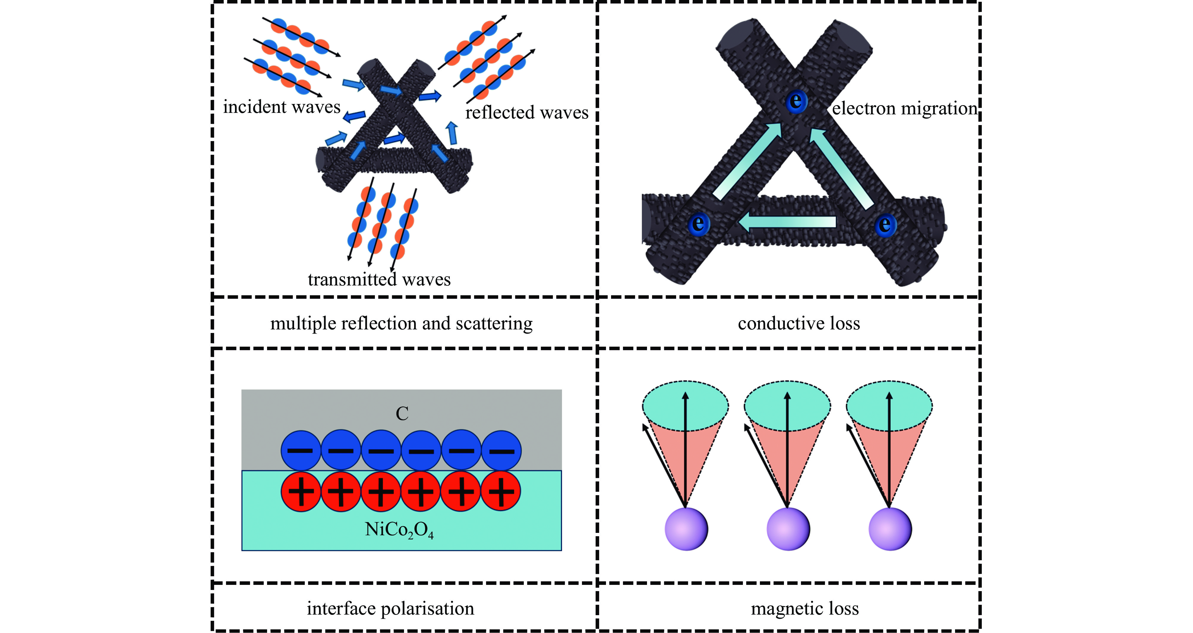 日益增长的电磁辐射对电子设备、人体健康、环境等造成了严重的危害。从生物质衍生的碳基材料,由于高孔隙率、低密度、介电损耗强、来源广泛、成本低廉等优点被认为具有极强的电磁吸收潜力。基于此,本研究以丝瓜作为碳前驱体,引入NiCo2O4磁性粒子,制备了NiCo2O4/C电磁波吸收材料(NCO)。NiCo2O4粒子的引入,不仅增强了复合材料的磁损耗性能,还调节了介电性能,优化了阻抗匹配。由于独特的网状结构以及界面极化、电导损耗、磁损耗等损耗机制的协同作用,NiCo2O4/C复合材料获得了良好的电磁波吸收特性,其最强反射损耗为−47.46 dB,最宽吸收频带为5.68 GHz(12~17.68 GHz),几乎覆盖整个Ku波段。此外,本研究还通过雷达散射截面面积仿真,证明了NCO-2复合材料具有一定的实际应用价值。这项工作为开发绿色可持续的高性能生物质衍生碳基复合材料提供了理论和实验基础。