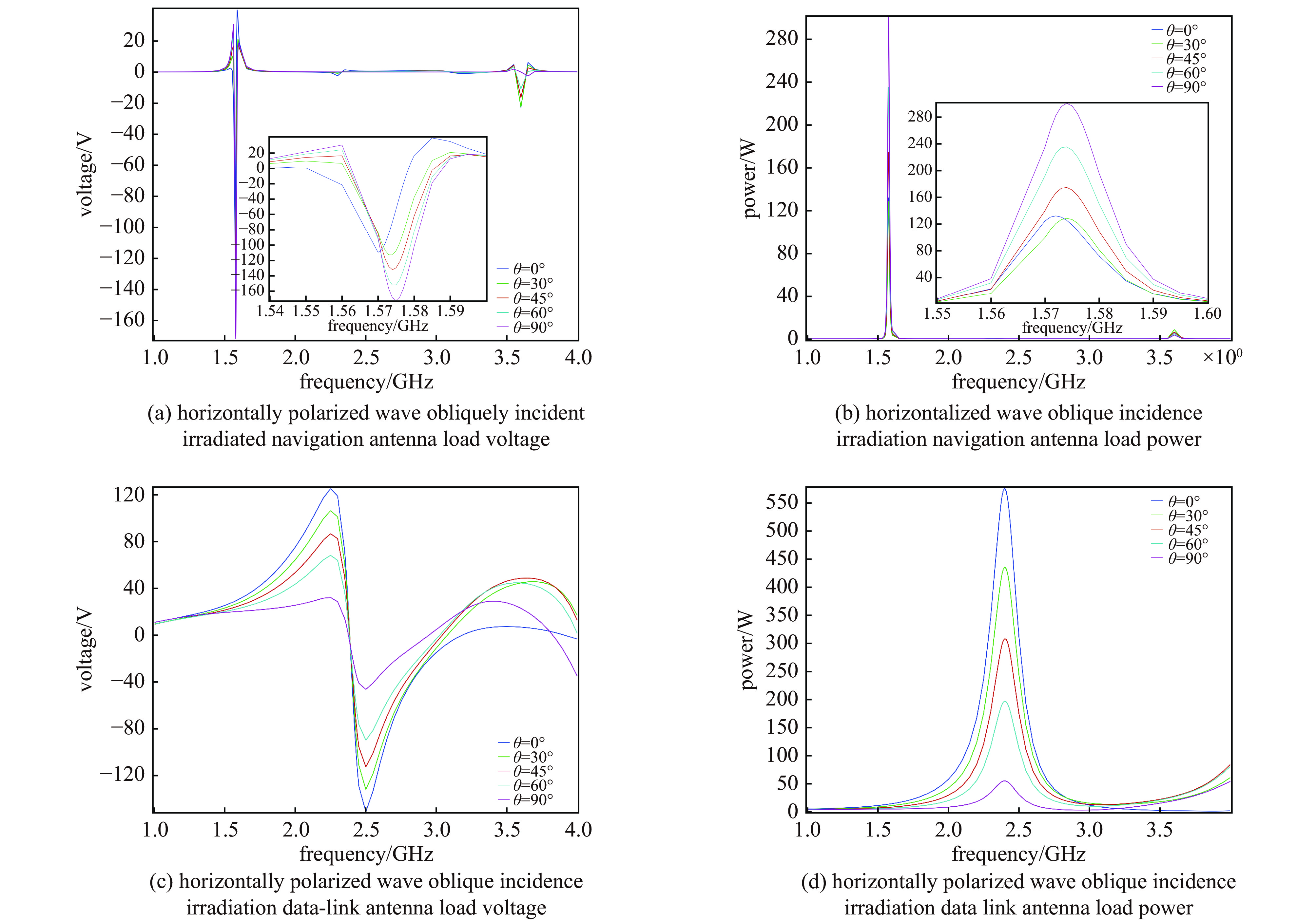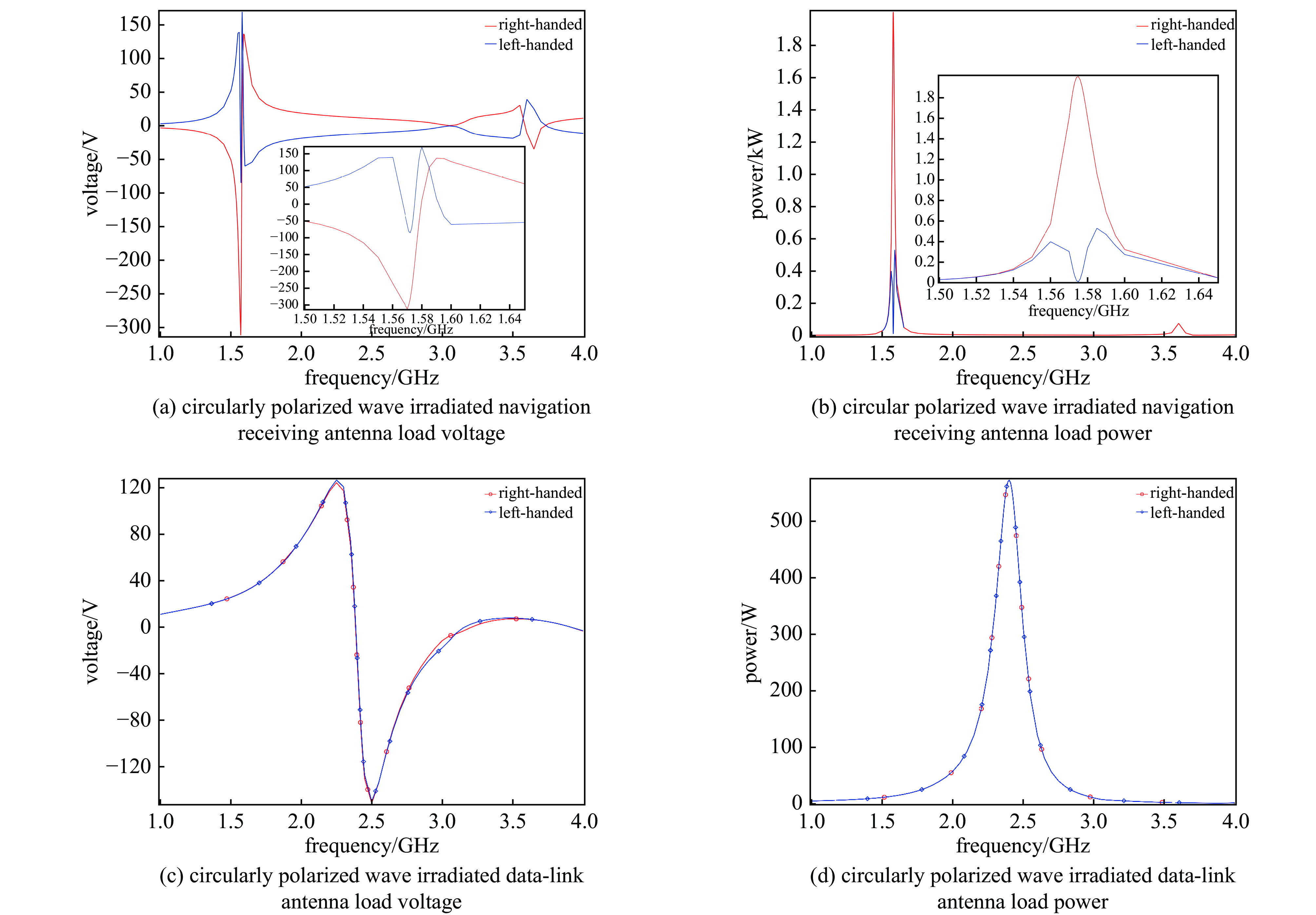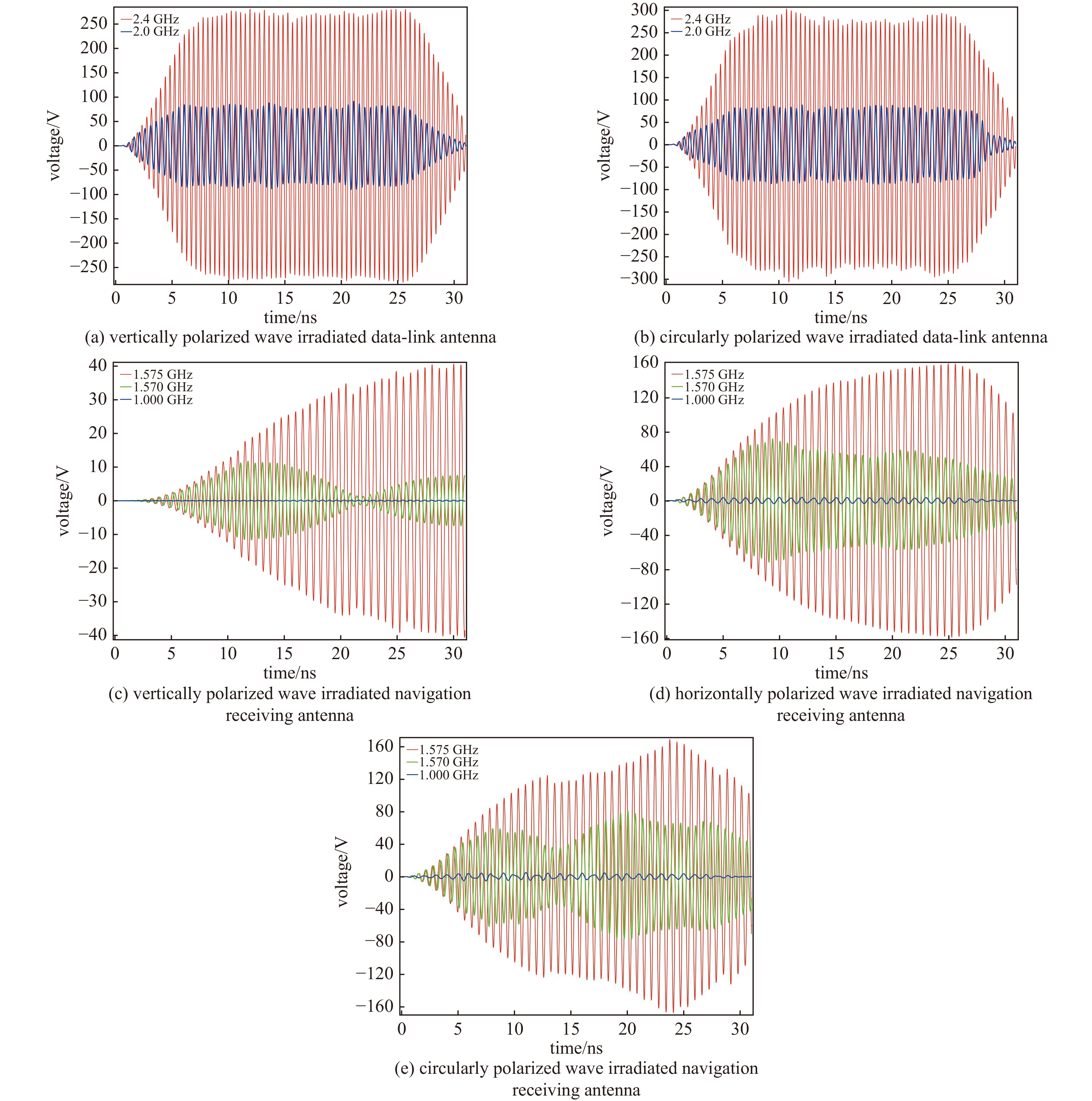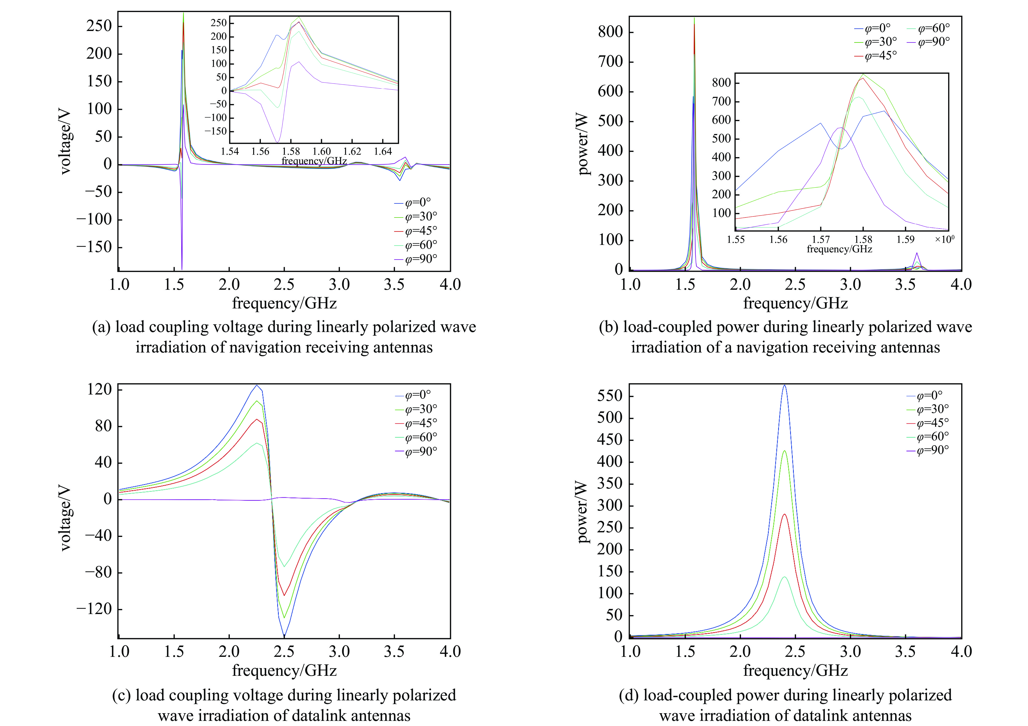 无人机蜂群与低空经济的发展凸显了高功率微波(HPM)攻防技术的战略价值。针对无人机导航天线和数据链天线,基于COMSOL构建三维电磁耦合模型,通过场-路协同仿真分析其在HPM辐照下的时频响应特性。结果表明:导航天线在带内及邻近频段无论线极化或圆极化激励,均出现上升沿展宽、下降沿“截断”等波形失真,因其等效为窄带移相网络,在“宽带”脉冲激励下引发强烈色散,导致时域波形畸变;而数据链天线在各类激励下波形保持完整,其原因是幅频与相频响应平坦,色散弱。频域结果显示,两类天线最大耦合电压偏移于中心频点,最大功率位于中心频点。导航天线对右旋圆极化响应最强,但频偏时出现左旋耦合增强现象;数据链天线对各类极化响应相近,呈极化不敏感性。研究认为,天线的极化类型与频率选择性通过内在色散机制主导HPM耦合过程,决定能量响应与波形完整性,建议构建“前端滤波−瞬态抑制−系统冗余”的多层级防护体系,提升无人机电磁韧性。