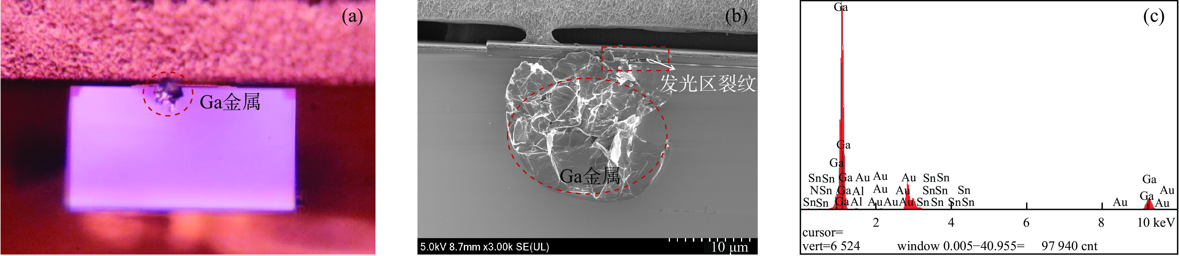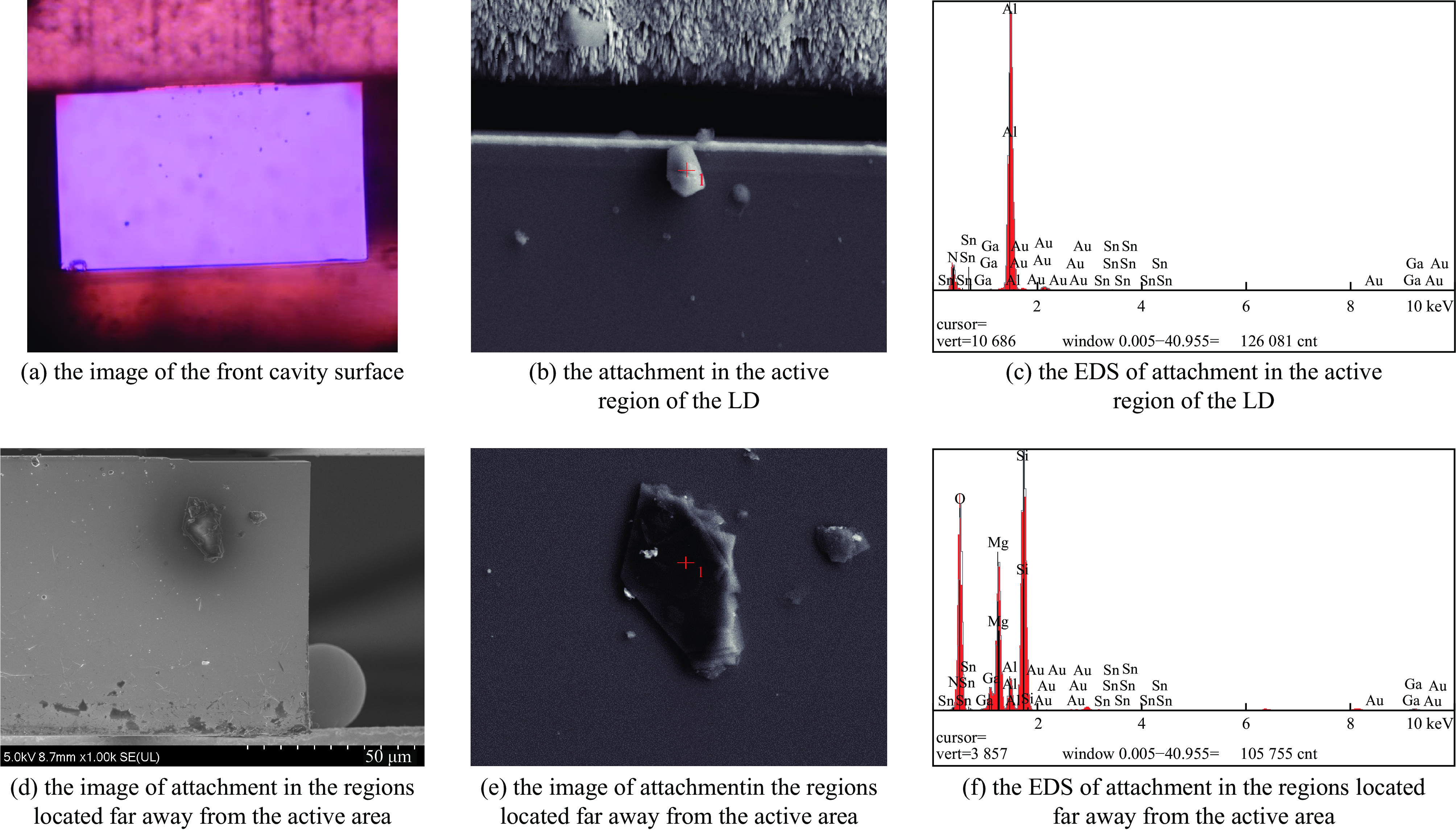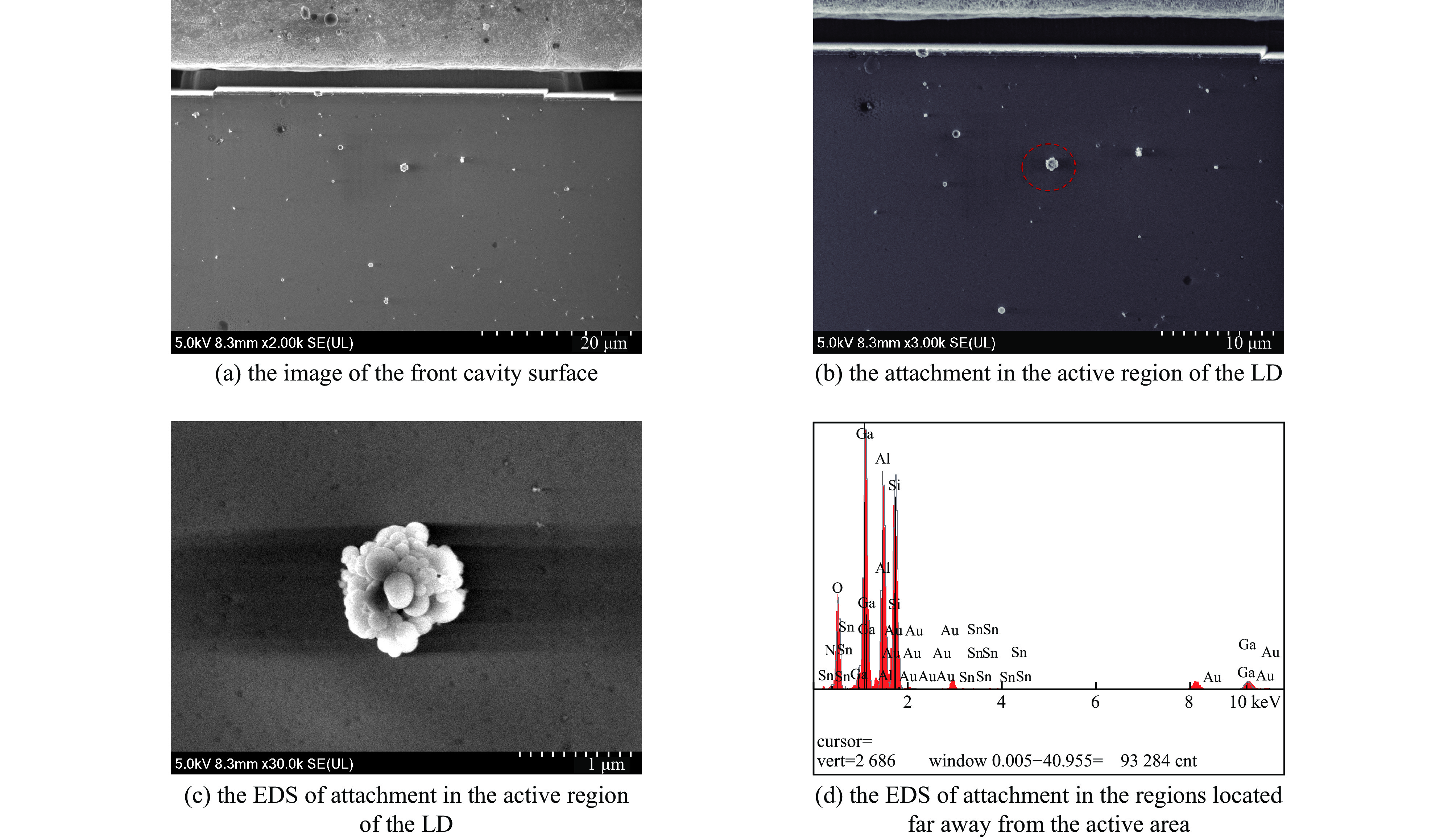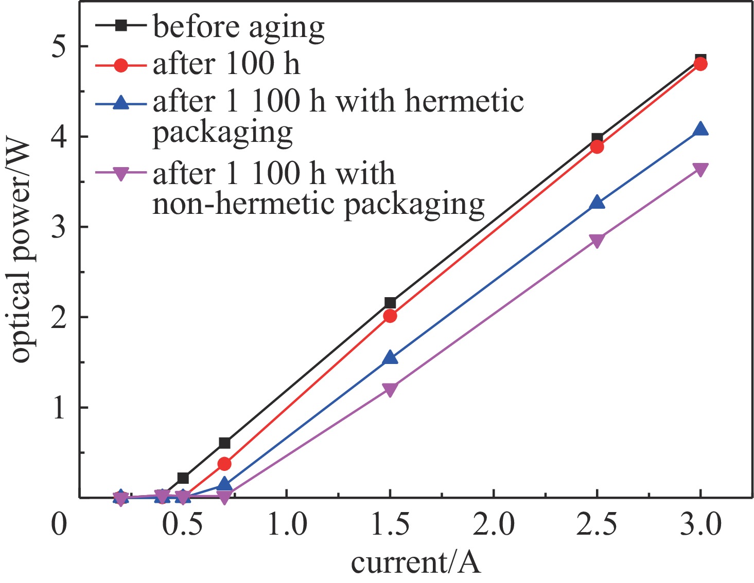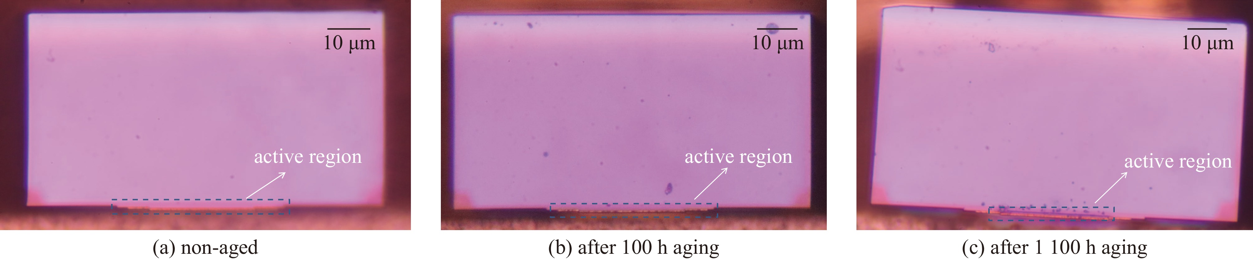 高功率GaN基蓝光二极管激光器在工业加工、铜材料焊接、3D打印、水下激光通信等技术领域有着广泛的应用前景。蓝光二极管激光芯片COS单元器件具有热阻低和尺寸小的优点,但是该器件存在可靠性较低的问题,导致其在工业化应用中受到一定限制,因此对其性能退化因素进行深入研究。基于光学显微技术、扫描电子显微表征和能谱分析手段对经过长时老化考核后器件的性能退化因素进行分析研究。实验研究和分析表明,GaN基体材料缺陷、腔面多余物沉积和光化学腐蚀是导致蓝光二极管激光芯片性能退化的主因,同时良好的气密性封装可提高二极管激光芯片的可靠性。